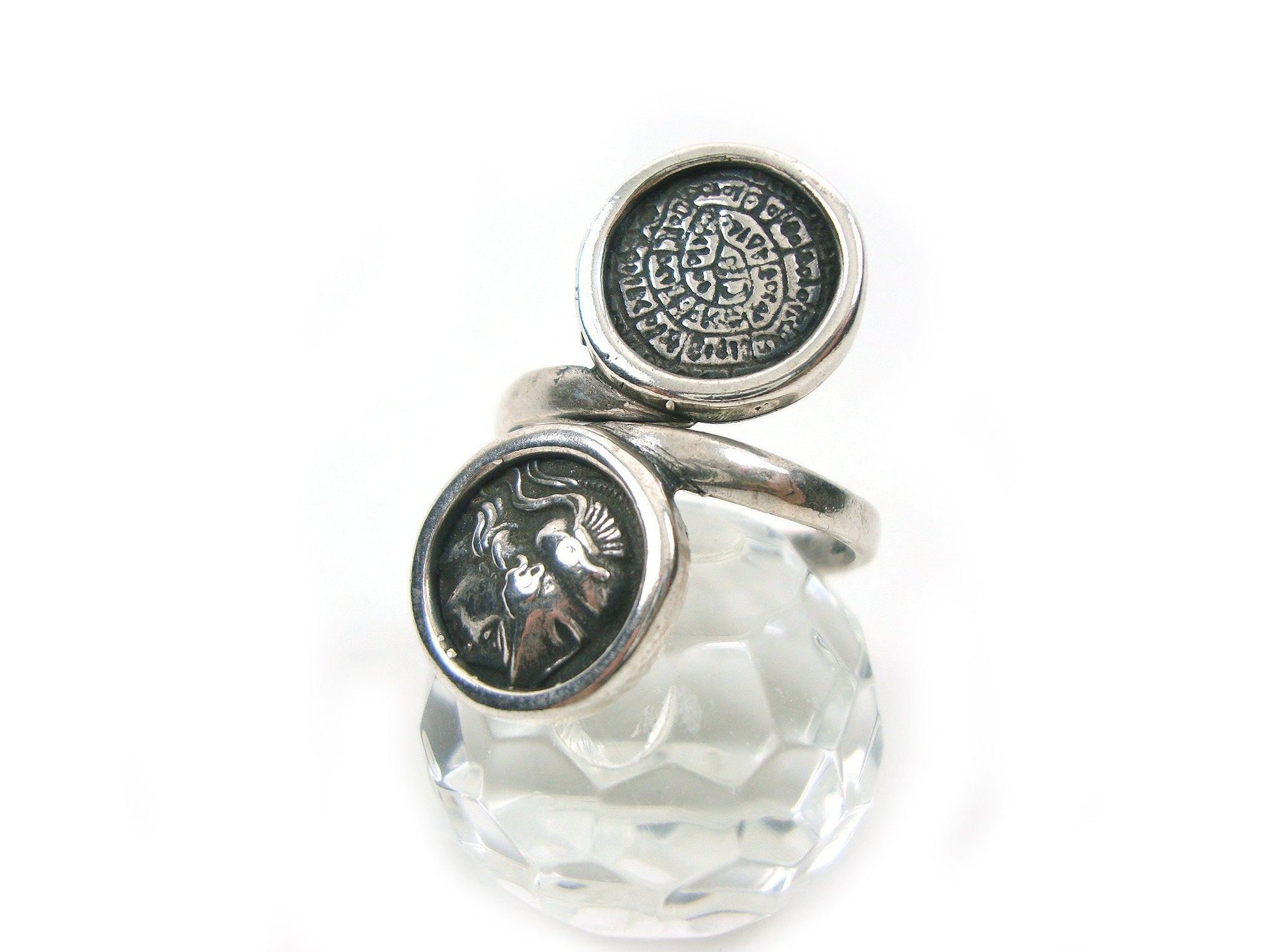Sterling Silver 925 Phaistos Disc Greek Minoan 13mm & Goddess Athena Greek Coin 13mm Adjustable Ring, Greek Silver Ring, Greek Jewelry