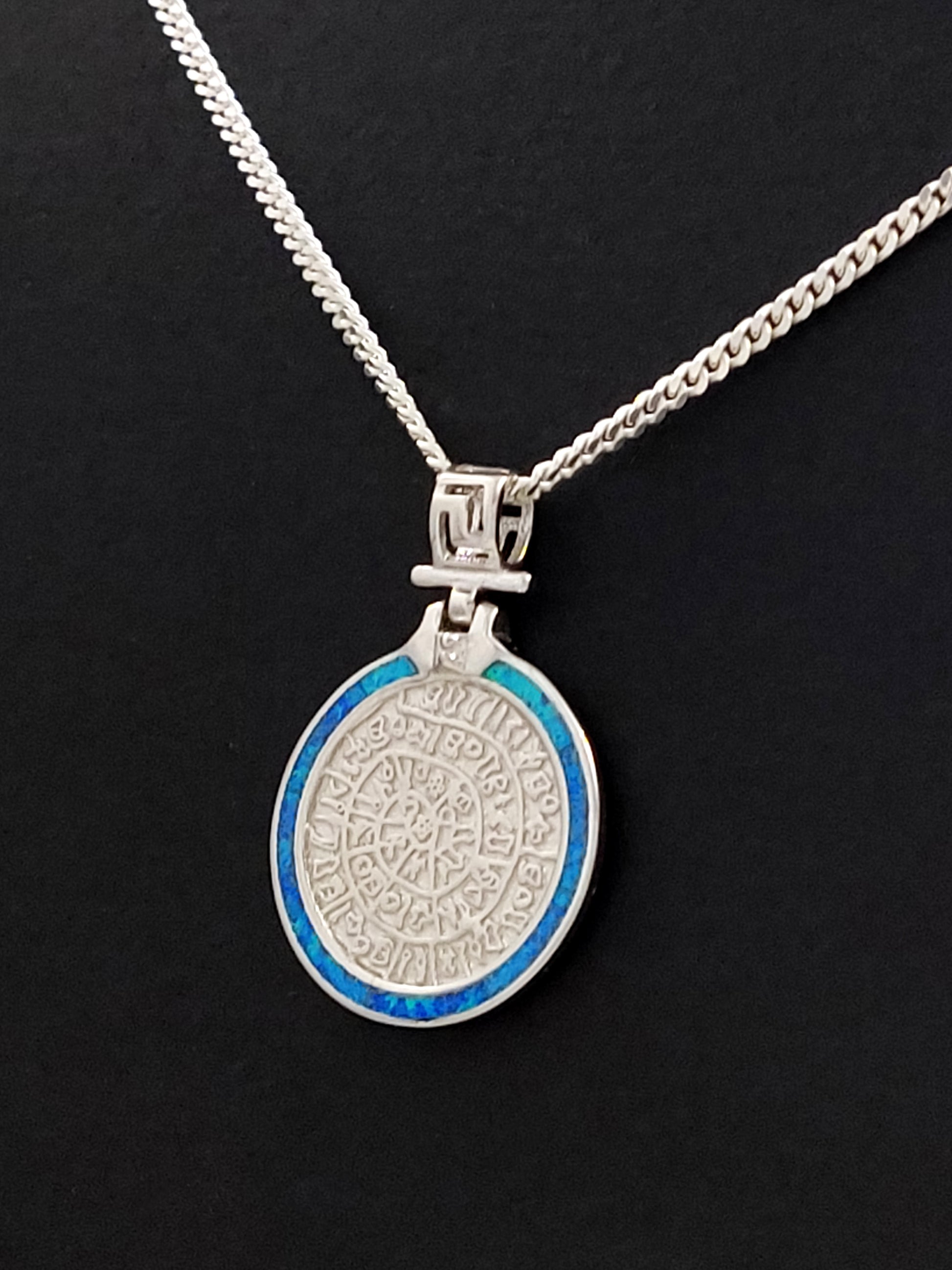 Phaistos Disc Blue Opal Greek Silver Necklace Pendant 22mm