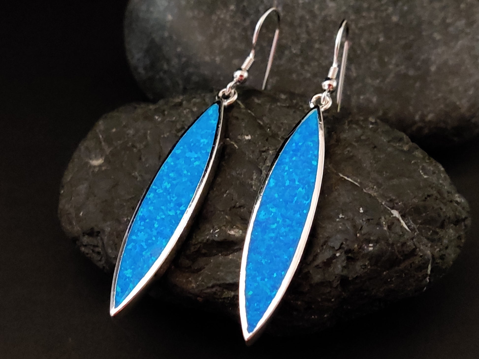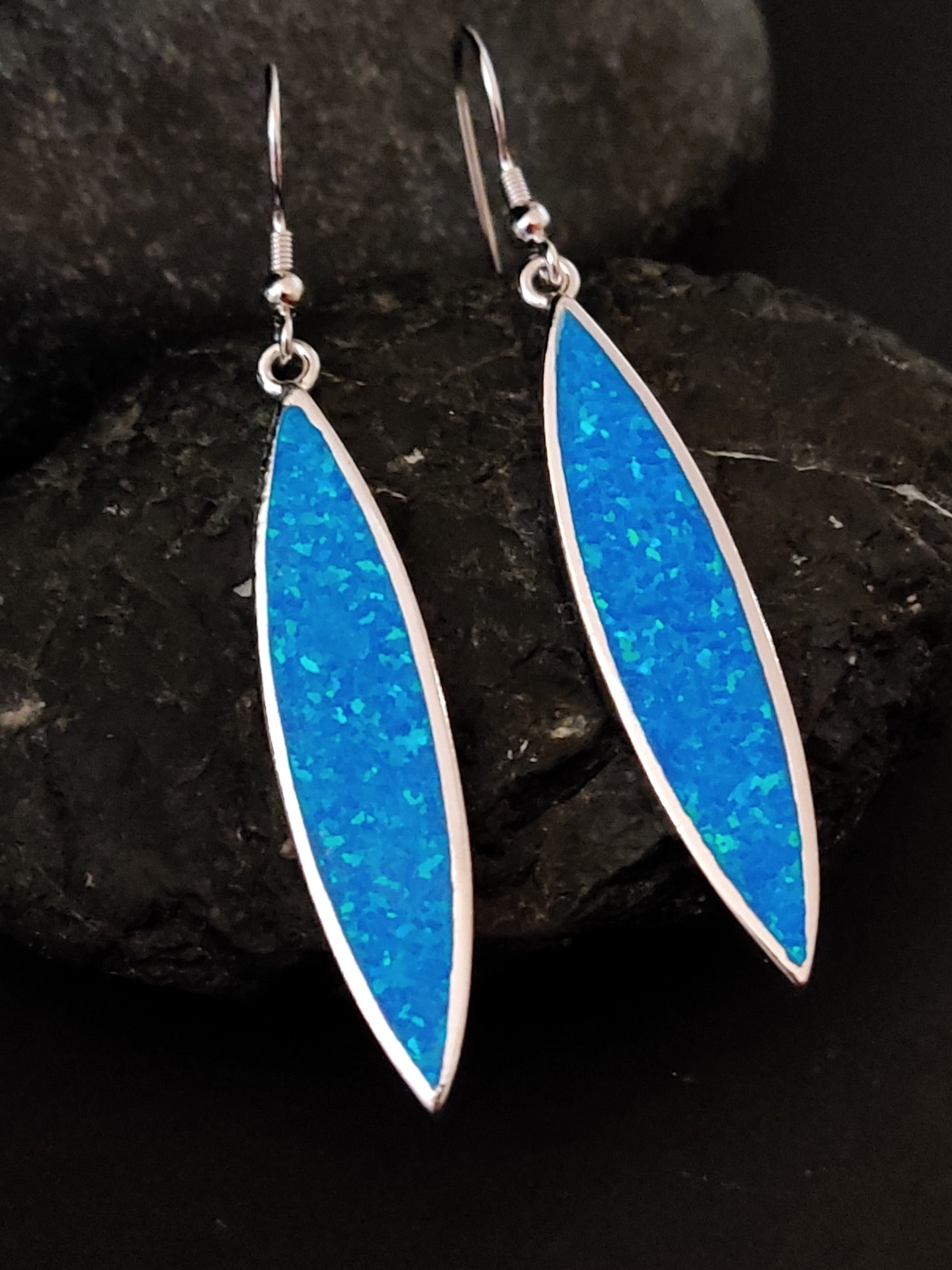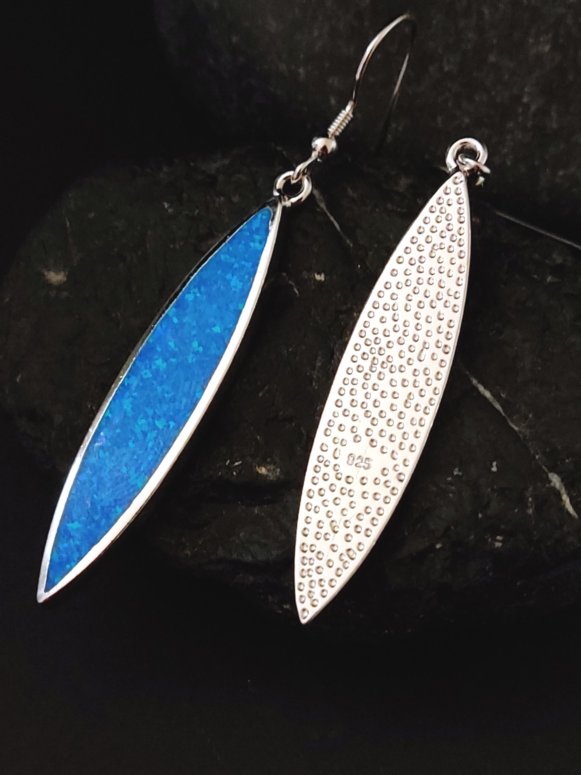 Blue Opal Eye Shape Silver Dangle Earrings 38x9mm