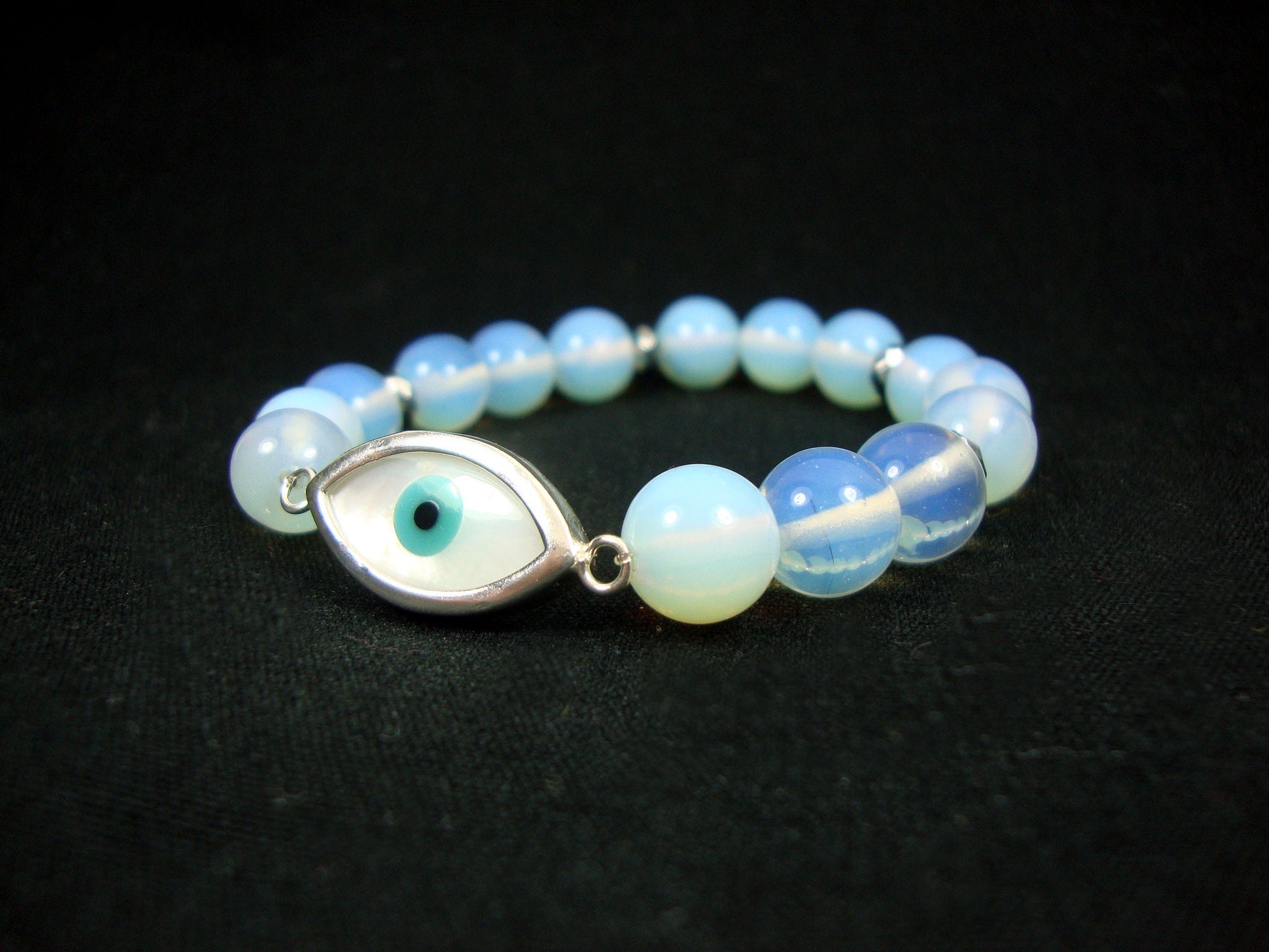Sterling Silver 925 Evil Eye 12x23mm - Moonstone 10mm Stretch Greek Bracelet, Greek Evil Eye Bracelet, Evil Eye Bracelet, Greek Jewelry