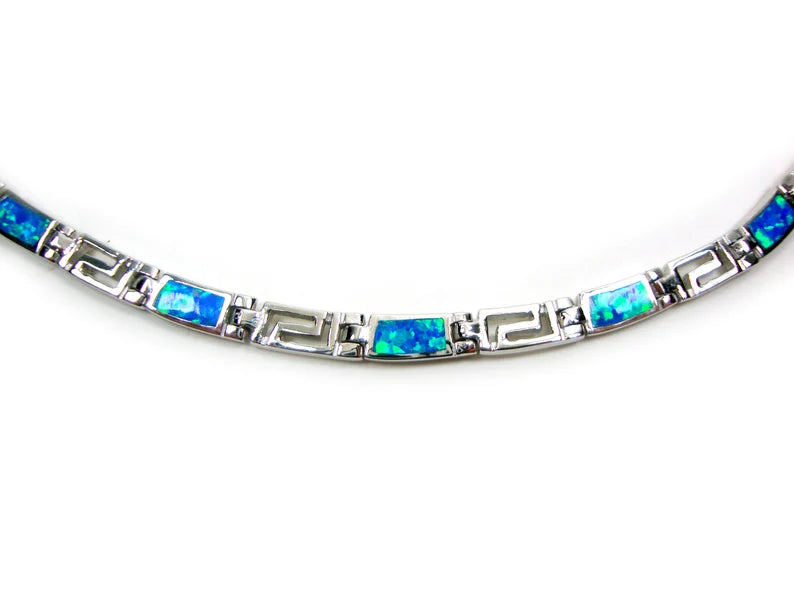 Sterling Silver 925 Greek Meander Fire Rainbow Blue Opal Necklace