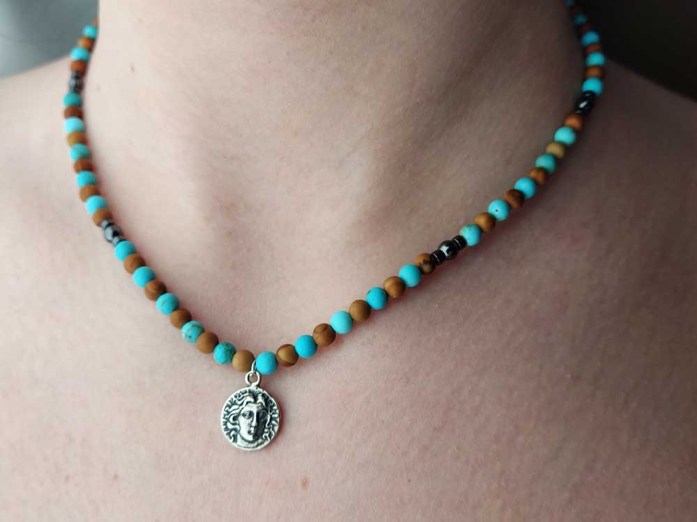 Turquoise - Jasper Stones Necklace & Greek God Apollo Silver Pendant
